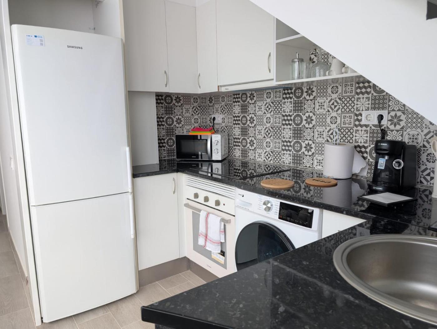 También hay una zona de comedor y una cocina equipada con nevera, microondas y fogones.