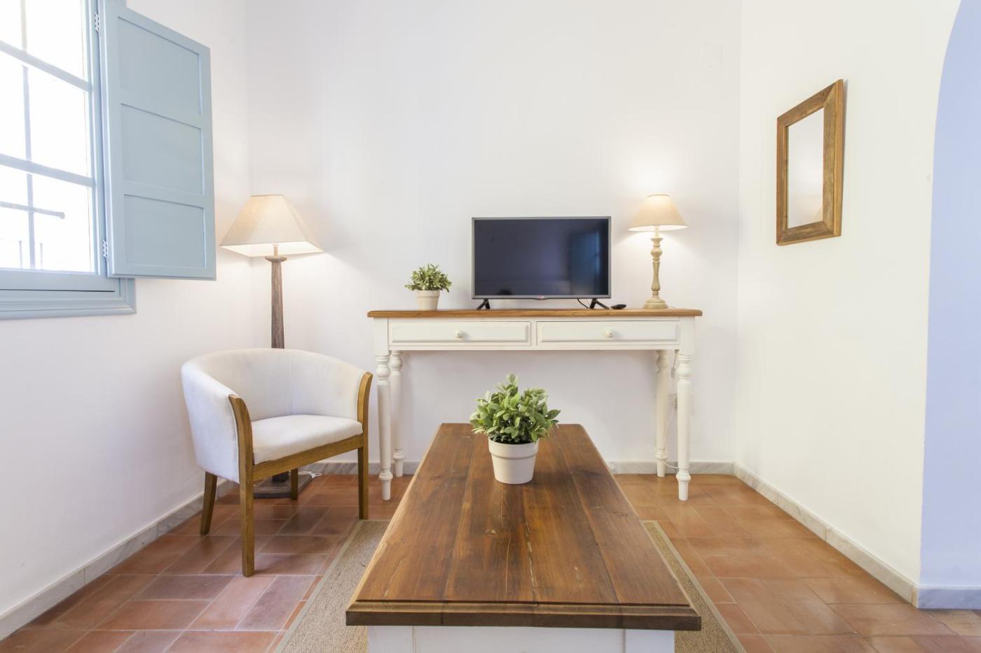 Apartamento Estándar de 1 dormitorio. Este apartamento amplio y elegante presenta una decoración luminosa de estilo andaluz y cuenta con una zona de salón encantadora con sofá y TV. También hay una zona de cocina y un dormitorio con 1 cama doble o 2 individuales. ;